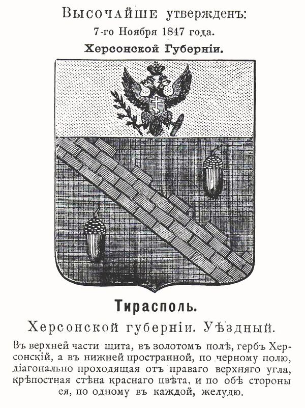 Первый герб Тирасполя был утверждён 7 ноября 1847 года высочайшим рескриптом императора Николая I. Герб города представлял собой щит, в верхней части которого, в золотом поле располагался герб Херсонской губернии 1803 года, а в нижней, пространной, — по чёрному полю, диагонально проходящая от правого верхнего угла, крепостная стена красного цвета, и по обе стороны её — по одному жёлудю[19].