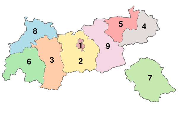 Федеральная земля состоит из 8 округов (Bezirke) и одного города земельного подчинения.
