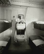 На палубе F располагались два больших кубрика, один — на 53 кочегара, другой — на 40 стюардов. Здесь же были места четырёх смазчиков и пяти почтовых клерков. В кормовой части находились кухня обеденного салона третьего класса, каюты главного механика и его помощников[63]. В носовой оконечности палубы G располагались кубрики для 15 кочегаров и 30 смазчиков. За ними по правому борту размещалось почтовое отделение, в котором сортировались почтовые отправления[64]. Пространство между переборками М и N занимали кладовые с мясом, рыбой, молоком, мороженым, фруктами, овощами, яйцами, маслом и камера разморозки. Для быстрой доставки продовольствия на кухни использовались конвейерные лифты. Основная часть продуктов хранилась в больших морозильных камерах. В роли хладагента в них выступал углекислый газ. Каждая рефрижераторная установка состояла из двух сдвоенных компрессоров. В конденсаторы закачивалась морская вода из танка на нижней палубе, охлаждая газ, сжиженный при большом давлении. Затем хладагент подавался в рубашки охлаждения различных отсеков и возвращался в компрессоры для повторного использования[65].