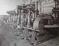 Водяной пар из котлов по двум главным паровым магистралям диаметром 53 см поступал в паросепараторы, где от него отделялись твёрдые частицы и капельная влага[71]. Затем пар при температуре 201 °С поступал под давлением 14,6 атм во второй цилиндр паровой машины диаметром 1,37 м. После расширения пара в цилиндре происходила его декомпрессия. Имея на выходе давление 5,3 атм и температуру 161 °С, пар направлялся в третий цилиндр среднего давления диаметром 2,13 м. Здесь процесс повторялся, и пар под давлением в 1,6 атм подавался в два цилиндра (первый и четвёртый) низкого давления диаметрами по 2,46 м. При частоте оборотов в минуту, равной 75, одна машина потребляла до 2,8 т пара за тот же промежуток времени[72]. На выходе из паровых машин пар имел давление 0,61 атм и температуру 87 °С[73].