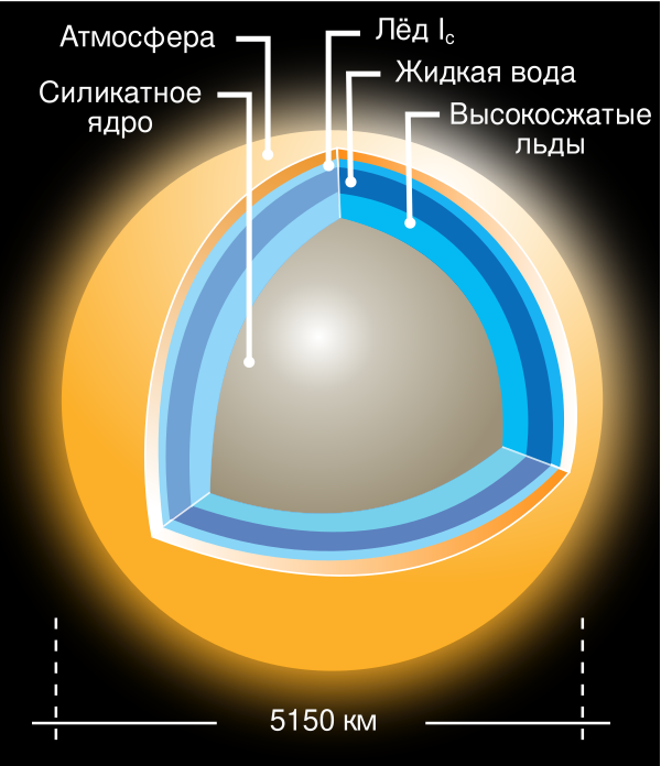 Согласно расчётам, Титан имеет твёрдое ядро, состоящее из скальных пород, диаметром около 3400 км, которое окружено несколькими слоями водяного льда[91]. Внешний слой мантии состоит из водяного льда и гидрата метана, внутренний — из спрессованного, очень плотного льда. Между этими слоями возможно существование прослойки из жидкой воды.