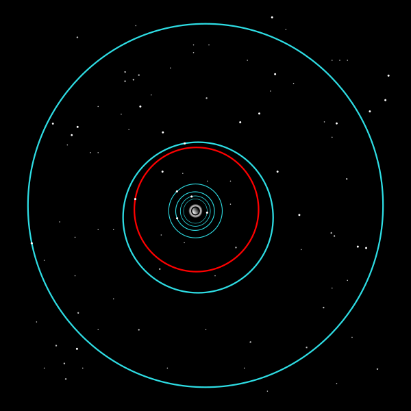 Радиус орбиты Титана составляет 1 221 870 км[1] (20,3 радиуса Сатурна). Таким образом, Титан находится вне колец Сатурна, крайнее из которых (Е) находится примерно в 750 000 км. Орбиты двух ближайших спутников проходят в 242 000 км дальше от Сатурна (Гиперион) и в 695 000 км ближе к планете (Рея). Орбиты Титана и Гипериона образуют орбитальный резонанс 3:4. Титан делает четыре оборота вокруг Сатурна, в то время как Гиперион только три[18].