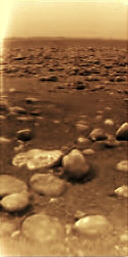 На снимках непосредственно с поверхности видны камни (вероятно, ледяные) округлой формы. Такая форма могла образоваться в результате длительного воздействия на них жидкости. Вероятно, в приэкваториальной области, где приземлился «Гюйгенс», возможны только временные пересыхающие метановые озёра, образующиеся после крайне редких дождей.