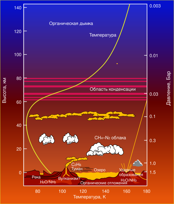 Температура у поверхности Титана составляет в среднем −180 °C[47]. Из-за плотной и непрозрачной атмосферы[48] разница температуры между полюсами и экватором составляет всего 3 градуса. Такие низкие температуры и высокое давление противодействуют таянию водяного льда, вследствие чего в атмосфере практически нет воды.