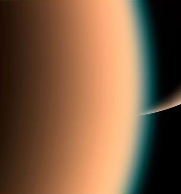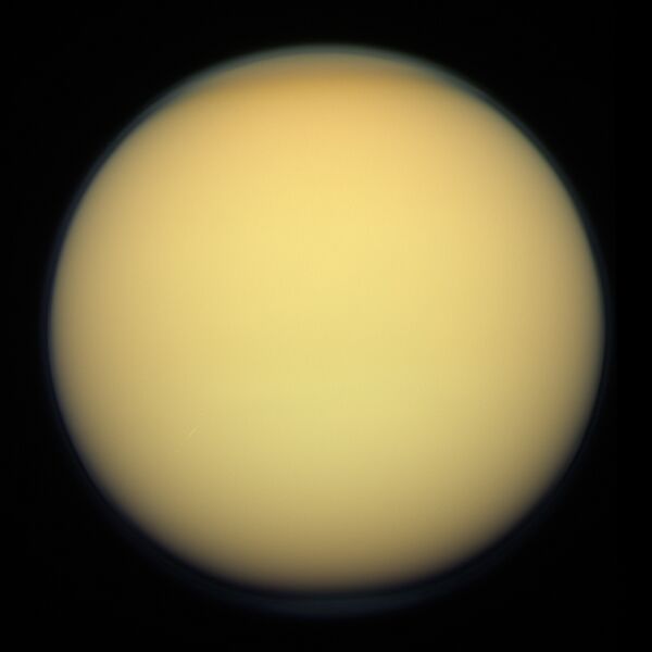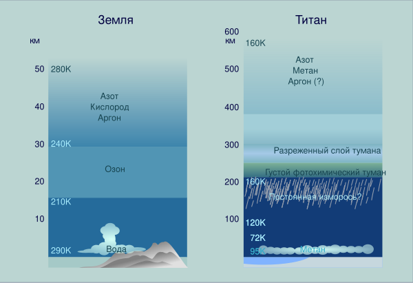 При сопоставимых размерах с Меркурием и Ганимедом, Титан обладает обширной атмосферой, толщиной более 400 км[25][26]. По современным оценкам атмосфера Титана состоит на 95 % из азота и 4 % метана, атмосферное давление у поверхности в 1,5 раза больше чем у Земли[27][28]. Наличие метана в атмосфере приводит к процессам фотолиза в верхних слоях и образованию нескольких слоёв углеводородного «смога», из-за чего Титан является единственным спутником в Солнечной системе, поверхность которого невозможно наблюдать в оптическом диапазоне.