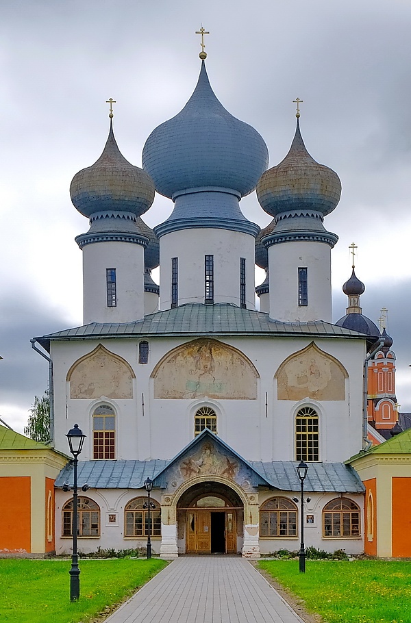 - Трёхглавый Успенский собор был построен для хранения иконы за 45 лет до основания монастыря, преположительно той же артелью, что и собор Хутынского монастыря; возможно, под наблюдением итальянского («фряжского») зодчего[1]. В XVIII веке он претерпел ряд изменений: был разобран придел во имя святителя Николая, несколько длинных и узких окон перед чудотворной иконой были заменены одним большим, чугунные плиты пола были заменены лещадными, амвон стал гранитным[1]. Кроме того, настенная живопись собора в XVIII веке была счищена, и стены вновь были расписаны под руководством иконописца Логгина Шустова[1]. В XIX веке обнесён галереей с массивными кубическими приделами.