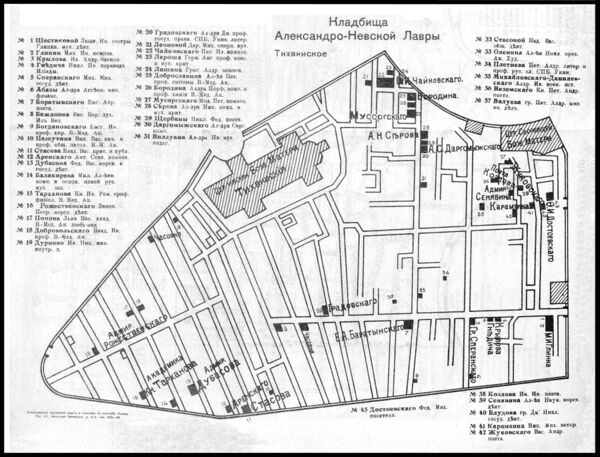 - Алфавитный указатель исторических могил, находящихся на кладбищах гор. Петрограда и его окрестностей // Отдел IV: Алфавитный указатель исторических могил… // Весь Петроград на 1917 год, адресная и справочная книга г. Петрограда. — Петроград: Товарищество А. С. Суворина — «Новое время», 1917. — С. 486—489. — ISBN 5-94030-052-9.