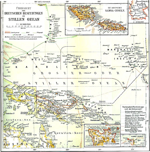 | Место | Циндао, Архипелаг Бисмарка, Германская Новая Гвинея, Науру, Германское Самоа, Каролинские острова, Марианские острова, Маршалловы острова, Папеэте, Гуам | ||