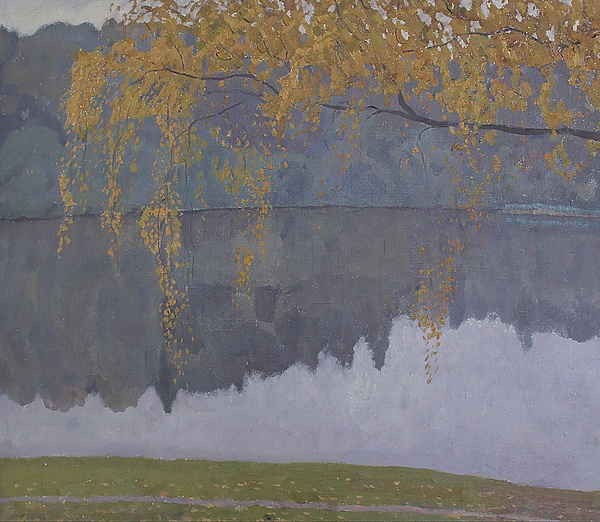 На переднем плане картины изображена узкая полоса берега водоёма, покрытая травой и усыпанная опавшими жёлтыми листьями. Над поверхностью воды располагается осенняя ветка ивы, подчёркивающая сезон осени. В воде отражается хмурое небо, что усиливает атмосферу картины. На втором плане виден берег, поросший лесом.