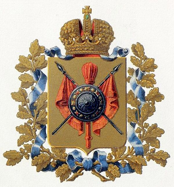 «В золотом щите червленная атаманская булава, на которой чёрный щит Ермака, круглый, украшенный драгоценными камнями, между двумя косвенно накрест положенными червлёными знаменами с чёрными древками и остриями от копья. Щит увенчан Императорскою короною и окружён золотыми дубовыми листьями, соединёнными Андреевскою лентою»[13].