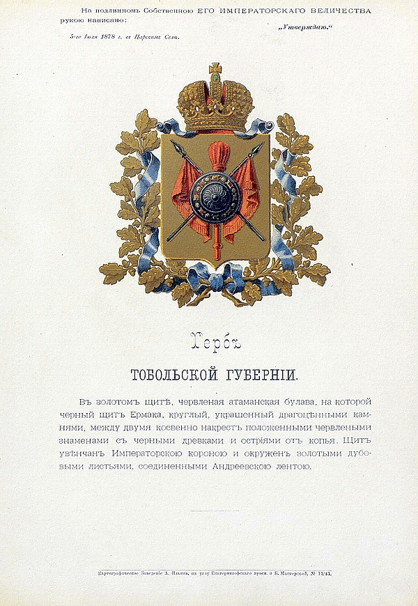 Герб Тобольской губернии утверждён 5 июля 1878 года: