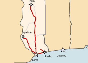 По оценке 2007 года общая протяжённость автомобильных дорог составляет около 11 700 км, из них с твёрдым покрытием — 2376 км (1999). Главные дороги идут в глубь Того через административные центры областей (транспортный коридор для выхода к морю Буркина-Фасо, Мали, Нигера) и вдоль побережья Атлантического океана.