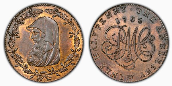 В 1768 году одно из крупнейших месторождений меди в мире было обнаружено в горном массиве Пэрис (Parys) на острове Англси на северо-западе Уэльса[9]. В 1785 году Томас Уильямс («Медный король»), действуя как представитель компании Parys Mine, встретился с мастером британского монетного двора, предложив ему бесплатно поделиться технологией чеканки королевских медных монеты с нанесением текста (гурта) на обод, что бы затруднило производство контрафактных монет. Условие Уильямса состояло в том, что в обмен на эту технологию медь для новых монет должна была поступать исключительно от компании Parys Mine. Британский монетный мастер не принял предложение. К 1786 году две трети монет, находящихся в обращении в Британии, были контрафактными, и Королевский монетный двор в ответ прекратил чеканку, лишь усугубив этим ситуацию[10]. Немногие из обращавшихся серебряных монет были подлинными[11]. Даже медные монеты часто переправляли и заменяли на более лёгкие подделки[11]. Королевский монетный двор не чеканил медных монет в течение 48 лет, с 1773 по 1821 год[12]. В тех редких случаях, когда Королевский монетный двор чеканил монеты, они были относительно грубого качества, а контроль их качества отсутствовал[10]. В феврале 1787 года под наблюдением Уильямса была осуществлена чеканка первого из многих частных выпусков медных жетонов, часть которых использовалась для оплаты труда работников компании Parys Mine[13]. Эти первые жетоны имели изображение друида с капюшоном, и в течение двух месяцев они привлекли внимание в Лондоне как возможное решение проблемы нехватки монет небольшого достоинства[14]. Вскоре после появления жетонов с друидом другие города, предприятия и владельцы последовали их примеру и начали разрабатывать и чеканить свои собственные монетовидные токены с небольшим номиналом[15].
