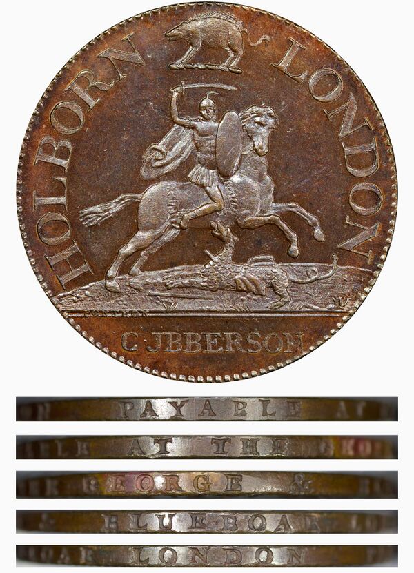 - Pye, Charles. A Correct and Complete Representation of all the Provincial Copper Coins, Tokens of Trade, and Cards of Address, on Copper, Which were circulated as such between the Years 1787 and 1801, when they were entirely superseded; a new copper coinage being at that time in circulation, issued by authority of government.. — Second. — Birmingham : Matthew Young, 1801.