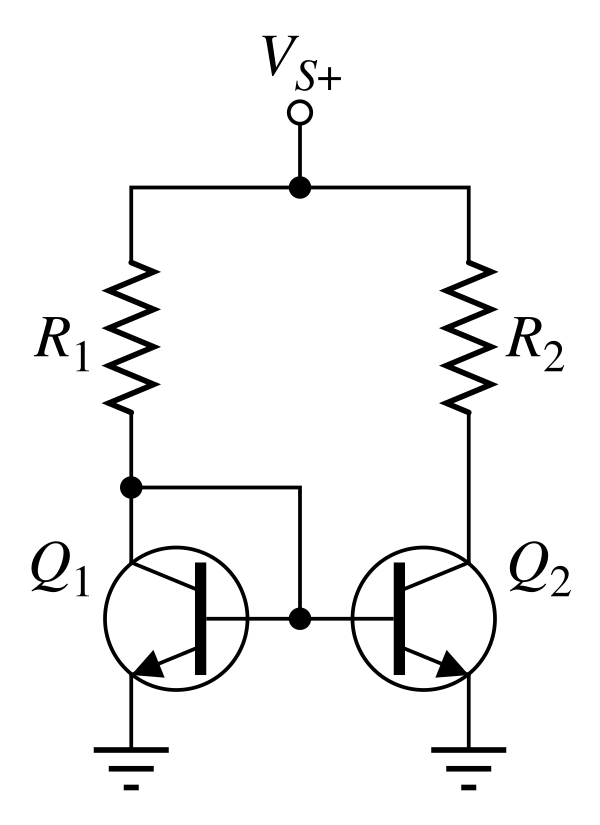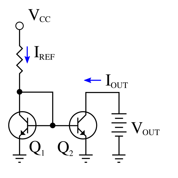 Если принять напряжение на переходе база-эмиттер транзистора в качестве входной величины и ток коллектора принять за выходную величину, то транзистор будет действовать как экспоненциальный преобразователь напряжение-ток. Применив отрицательную обратную связь (просто соединив базу Q1 с его коллектором) транзистор может быть «инвертирован», и он будет действовать как обратный логарифмический (экспоненциальный) преобразователь из тока в напряжение; теперь он будет регулировать «выходное» напряжение база-эмиттер (транзистора Q2) так, чтобы «скопировать» входной ток коллектора Q1 на коллектор Q2.