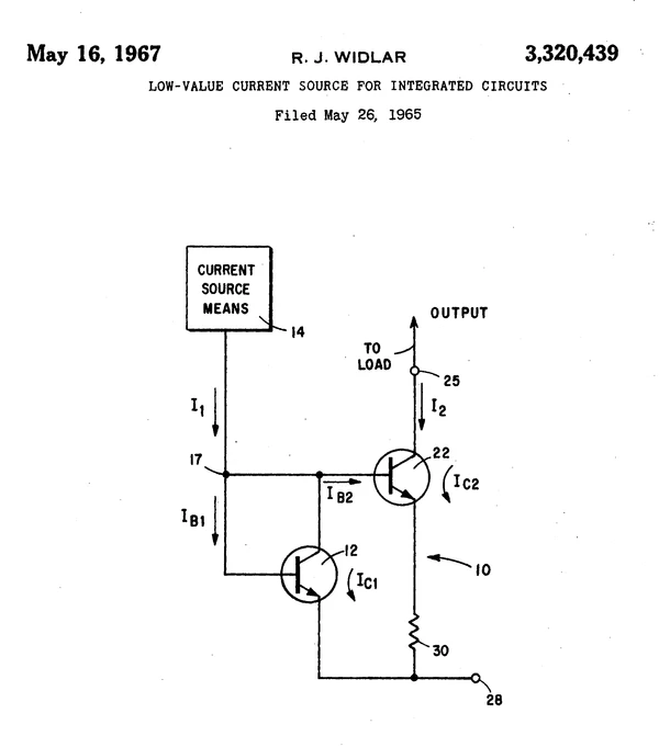 Таким образом, на соединённых вместе базе и коллекторе входного транзистора всегда устанавливается напряжение соответствующее порогу открытия транзистора при соответствующем токе коллектора, равным входному управляющему току минус небольшие токи баз входного и выходного транзисторов.