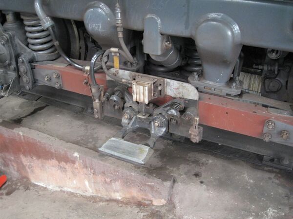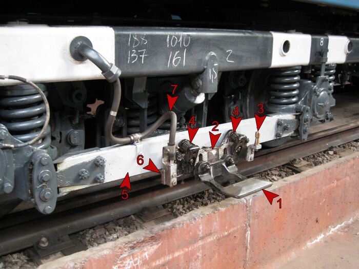 Каждый вагон оборудован четырьмя токоприёмниками, которые расположены с обеих сторон колёсных тележек вагона.