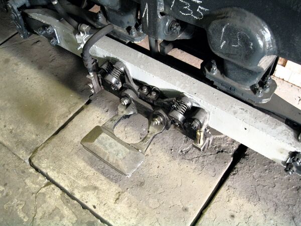 Всего же башмак токоприёмника имеет три положения: крайнее верхнее, рабочее горизонтальное (при работе на линии) и крайнее нижнее, необходимое для осуществления разрыва цепи между контактным рельсом и башмаком токоприёмника. Для фиксации башмака в отжатом положении используется специальный штифт, который вставляется в левый кронштейн токоприёмника.