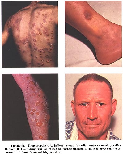 Может появиться на коже и слизистой оболочке рта и быть пятнистой (эритематозной), уртикарной и буллёзной. Развивается она чаще в результате приёма сульфаниламидных препаратов, производных барбитуратовой кислоты, салицилатов, антибиотиков, анальгина и других препаратов.