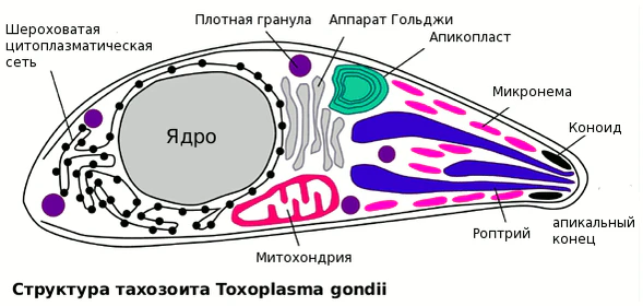 В этих промежуточных хозяевах паразит вторгается в клетки, формируя так называемые межклеточные паразитофорные вакуоли, содержащие брадизоиты, медленно воспроизводящиеся формы паразита[4]. Вакуоли формируют тканевые цисты, которые могут развиваться во внутренних органах, включая лёгкие, печень и почки, но при этом они более распространены в нервных и мышечных тканях — таких, как мозг, глаз, скелетная и сердечная мышца. Неповреждённые цисты не причиняют вреда и могут оставаться неизменными в течение жизни хозяина[5]. Так как паразит находится внутри клеток, то иммунная система хозяина не обнаруживает эти цисты. Сопротивляемость к антибиотикам различна, но цисты очень трудно вывести из организма полностью. Внутри этих вакуолей T. gondii размножается последовательностью делений на две части до тех пор, пока инфицированная клетка в конце концов не лопается и тахизоиты не выходят наружу. Тахизоиты подвижны и производят новых паразитов своего вида бесполым способом. В отличие от брадизоитов, свободные тахизоиты легко устраняются иммунной системой хозяина, но при этом могут заразить клетки и сформировать брадизоиты, тем самым поддерживая инфекцию. Кошки начинают распространять ооцисты (покрытые плотной оболочкой оплодотворённые яйцеклетки[6]) после проглатывания T. gondii любой из трёх инфекционных стадий — тахизоитов, брадизоитов (из тканевых цист) или спорозоитов (из ооцист)[7].