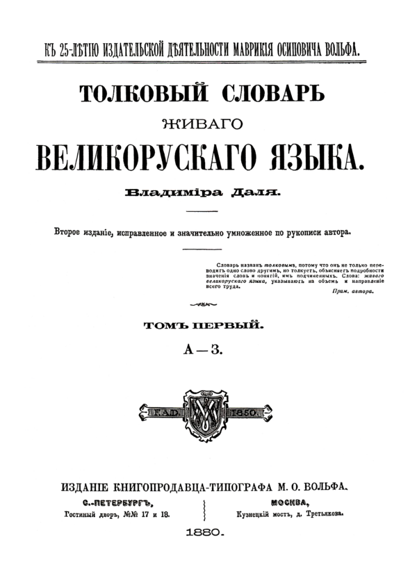 Первым опытом реализации этой задачи стал «Словарь церковнославянского и русского языка» 1847 года, содержавший 114 749 слов. Теоретическую основу словаря составило представление о трёх стихиях (церковнославянской, славяно-русской и старинной русской), из которых, по мнению составителей, сложился русский язык. Вслед за ним появился «Толковый словарь живого великорусского языка» В. И. Даля (1863—1866), поставивший в центр народную устную речь. Словарь включает около 200 тысяч слов; в нём принят алфавитно-гнездовой способ расположения, а иллюстрациями служат 30 тысяч пословиц и поговорок. Само название «толковый» было впервые применено Далем к словарю и дало название целому направлению в русской лексикографии[10][11].