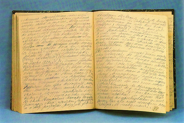 В 1841 г. на памятнике родной тёти А. И. Остен-Сакен в Оптиной пустыни было выгравировано первое восьмистишие Л. Н. Толстого[22]. С 11 марта 1847 г. Толстой находился в казанском госпитале, 17 марта он начал вести дневник, где, подражая Бенджамину Франклину, ставил перед собой цели и задачи по самосовершенствованию, отмечал успехи и неудачи в выполнении этих заданий, анализировал свои недостатки и ход мыслей, мотивы своих поступков. Этот дневник с небольшими перерывами он вёл на протяжении всей своей жизни.