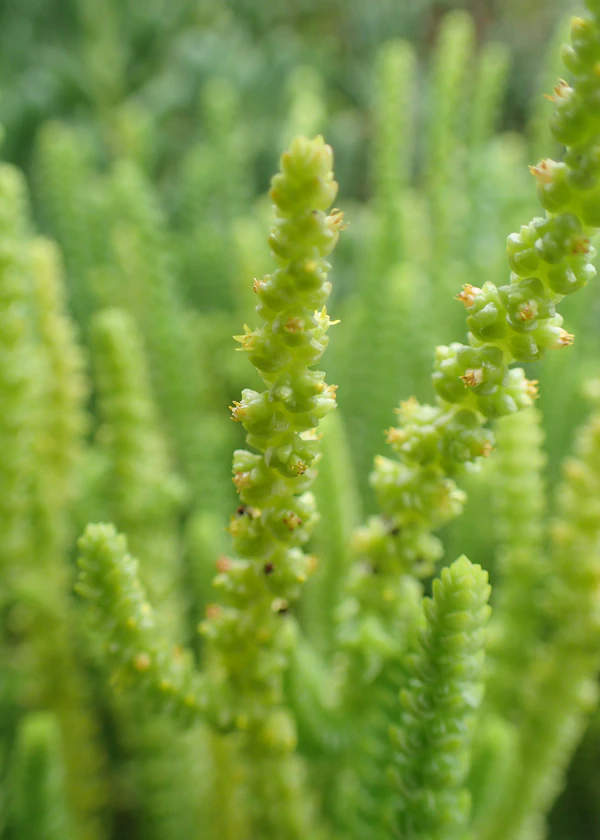 Толстянка плауновидная имеет очень маленькие светло-зеленые листья, которые плотно расположены вокруг тонкого стебля, а расположение листьев вокруг стеблей придает им квадратную форму. Растет в виде сложного куста с очень мелкими желто-зелеными цветками, максимальной высотой 15-20 см.