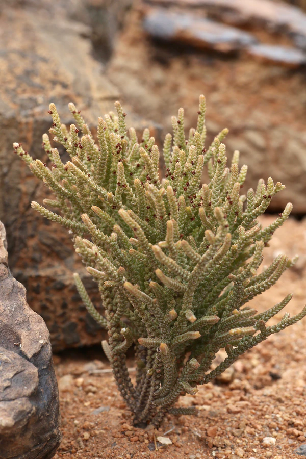 Многолетники высотой 0,1—0,4 м, с прямостоячими, полегающими или часто стелющимися ветвями, более или менее разветвленные, с обычно незаметными междоузлиями между листьями, более или менее одревесневающие, старые листья обычно остаются прикрепленными к ветвям. Листья сидячие, от треугольных до яйцевидных, 2-8 х 1-4 мм, острые или тупые, одинаковой длины на всем растении, голые, более или менее плоские с обеих сторон, мясистые и кожистые, зеленые, серо-зеленые, желтовато-зеленые или коричневый. Соцветие тирс с многочисленными обычно сидячими дихазиями в пазухах листьев, иногда с верхушечным разрастанием поочередно цветущих и вегетативных узлов, с сидячими 5-членными цветками. Чашечка: доли узкотреугольные, 0,8-1,5 мм длиной, обычно от половины до двух третей длины лепестков, острые, но не заостренные, мясистые, от зелёного до коричневого цвета. Венчик чашевидный, едва сросшийся у основания, бледно-желтовато-зеленый до коричневого; лопасти узкотреугольные, 1-2 мм длиной, резко острые и более или менее килеватые, прямостоячие. Тычинки с желтыми пыльниками. Чешуйки продолговато-клиновидные, 0,2—0,3 х 0,04—0,1 мм, усеченно-краевые, сначала резко, позднее постепенно суженные книзу, почти перепончатые до мясистых, бледно-желтые или белые. Семена 2, выходят в основном через верхушечное отверстие фолликула, реже через базальный кругорезкий разрез[2].