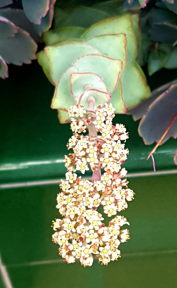 В период с июня по октябрь растение образует тирсовые, трихотомические и округлые соцветия. Цветки соединены со стеблями пурпурными цветоносами длиной до 20 миллиметров, частично скрытыми верхними листьями и прицветниками длиной не менее 3 миллиметров. Они звёздчатые, как и у других видов, принадлежащих к роду Толстянка, могут достигать 6 миллиметров в диаметре и обычно белого или розового цвета.