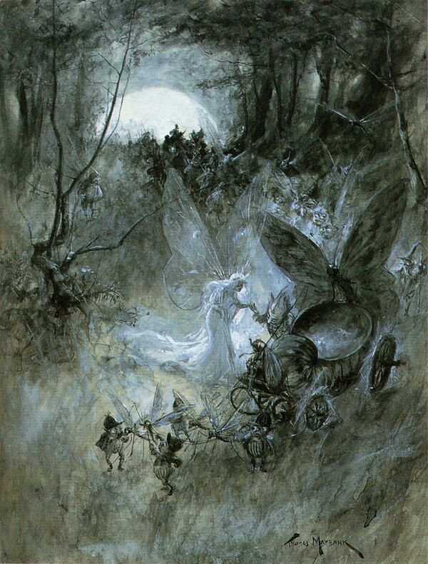 Томас Майбанк активно работал над сказочными образами между 1898 и 1912 годами, проживая в то время в провинции и лондонских пригородах: в Бакингеме, Кройдоне, Эшере. Считается, что он создал наиболее удачные свои станковые работы в этом жанре между 1902 и 1904 годами. К ним относятся «A Bank Holiday in Goblin Land», «Коронация Титании» и «New Year’s Eve». Считается, что он черпал вдохновение в работах Ричарда Дойла. Персонажами его работ были маленькие фигурки фантастических существ, часто нарисованных только пером и чернилами. Картины и акварели художника выставлялись в Королевской академии художеств, Королевском обществе британских художников, Королевской Гибернийской академии и Королевском институте художников, пишущих маслом[8].