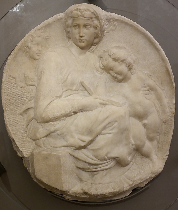 [Микеданджело] стал внимательно рассматривать два разделанных мраморных рельефа, которые создавал одновременно, то по ночам, во время бессонницы, то днем, когда не подымался на леса за забором вокруг статуи[а], а сидел дома. На обоих рельефах была божья матерь с младенцем и святым Иоанном. Он изучал оба внимательно, строго, однако ничего не прибавляя и не сглаживая, а только заботливо прослеживая каждый след удара по камню…