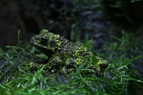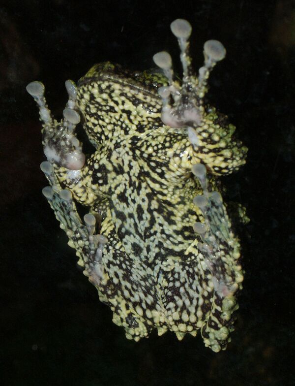 Наблюдается половой диморфизм — самки крупнее самцов. Так, общая длина тела самцов достигает 67—76 мм, в то время как самок — 68—74 мм[1]. Всё тело покрыто пузырьками и шипиками, благодаря чему поверхность лягушки напоминает кустики мха. Окраска состоит из зелёных и тёмных, почти чёрных широких поперечных полос, расположенных поочередно. Морда немного уплощённая, вытянутая и закруглённая на конце. На концах пальцев всех лап заметны развитые круглые присоски. Плавательная перепонка имеется только на задних лапах, она небольшая, достигает только середины пальцев.
