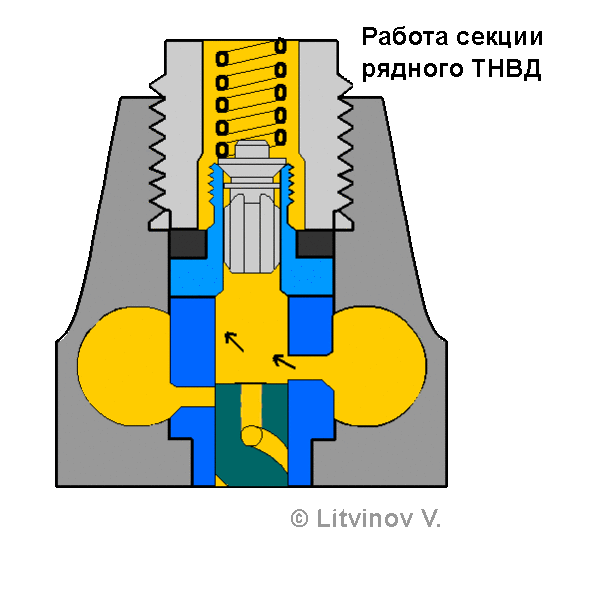 В момент движения плунжера вверх винтовой канал, находящийся на нём, совпадает со сливным каналом в гильзе. Остатки топлива, находящиеся над плунжером, начинают уходить на слив через осевой, радиальный и винтовой каналы в плунжере и сливной в гильзе. При опускании плунжера за счёт пружины открывается впускной канал, и объём над плунжером заполняется топливом от подкачивающего насоса.