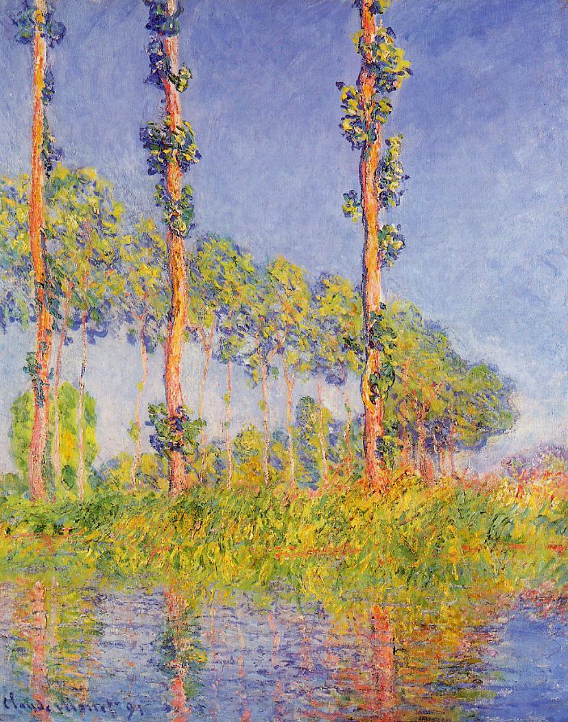 Тополя на берегу Эпт, фр. Peupliers au bord de l’Epte. 92,4 × 73,7 см. Справа внизу подпись и дата: Claude Monet 90. Британская галерея Тейт, Лондон, Великобритания. Инв. № N04183[26] (в реестре Лондонской национальной галереи инв. № L717[27]). | Предположительно впервые показана публике 29 февраля — 10 марта 1892 года на выставке в галерее Поля Дюран-Рюэля. Выкуплена у Моне неустановленным русским коллекционером. В 1924 году принадлежала парижскому арт-дилеру Полю Розенбергу. В 1926 году на пожертвование фонда N.A.C. приобретена для Лондонской национальной галереи и была передана в Британскую галерею Тейт[25]. |