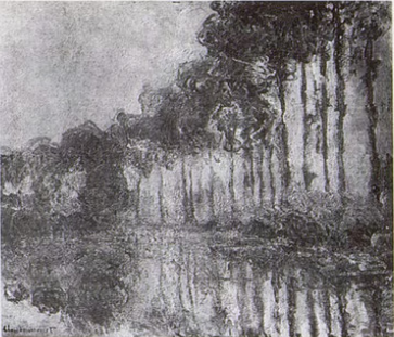 Тополя на берегу Эпт, облачная погода, фр. Peupliers au bord de l’Epte, temps couvert. 100 × 65 см. Справа внизу подпись и дата: Claude Monet 91. Культурный фонд Исе, Токио, Япония. | Выкуплена у Моне в январе 1892 года Полем Дюран-Рюэлем и сразу же была перепродана Поттеру Палмеру из Чикаго. В 1925 году выставлена на продажу в галерее Говарда Янга, где её вновь выкупил Дюран-Рюэль. Далее картина принадлежала Андре Морису из Парижа и Роберту И. Риксену из Нью-Йорка. 14 апреля 1965 года выставлена на торги в аукционном доме «Парк-Бернет», где её приобрел Карл Хаффенреффер. Далее находилась в галерее «Аквавелла», откуда перешла в собрание токийского Культурного фонда Исе[25]. |