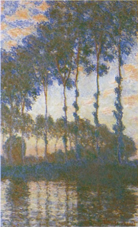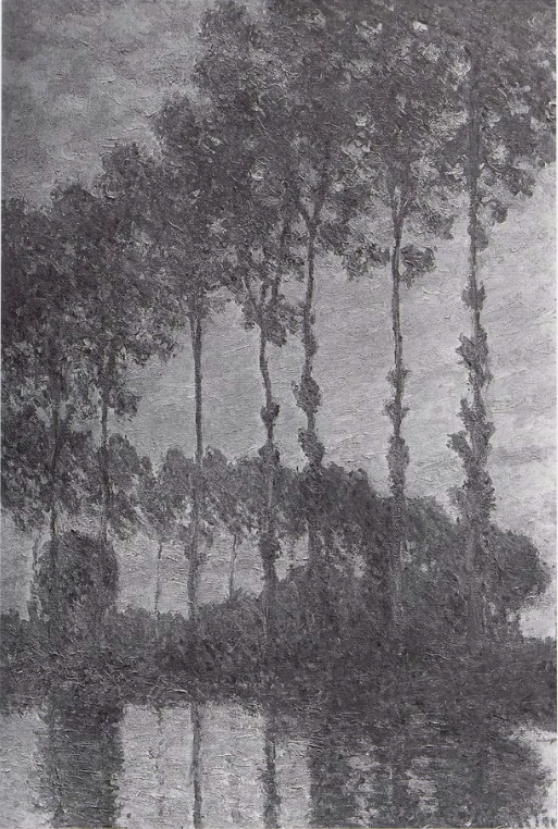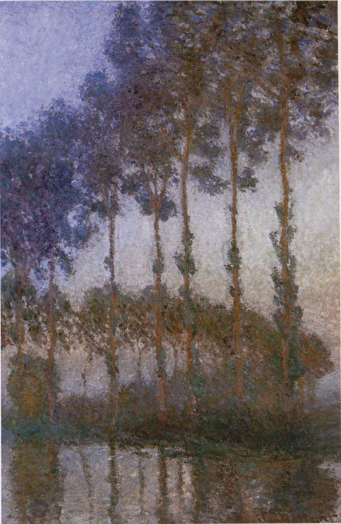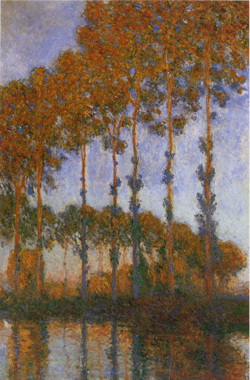 Тополя на берегу Эпт, сумерки, фр. Peupliers au bord de l’Epte, crépuscule. 100 × 65 см. Справа внизу подпись и дата: Claude Monet 91. Бостонский музей изящных искусств, Бостон, Массачусетс, США. Инв. № 161.1990. | Выкуплена у Моне в январе 1892 года Полем Дюран-Рюэлем и впервые показана публике 29 февраля — 10 марта 1892 года на выставке в его галерее, затем продана в неустановленную частную коллекцию. 27 ноября 1968 года выставлена на продажу в парижской галерее «Гальера», где она была перекуплена нью-йоркской галереей Дэвида Смарта, откуда продана в неназванную частную коллекцию. В 1990 году подарена Бостонскому музею изящных искусств[22]. |