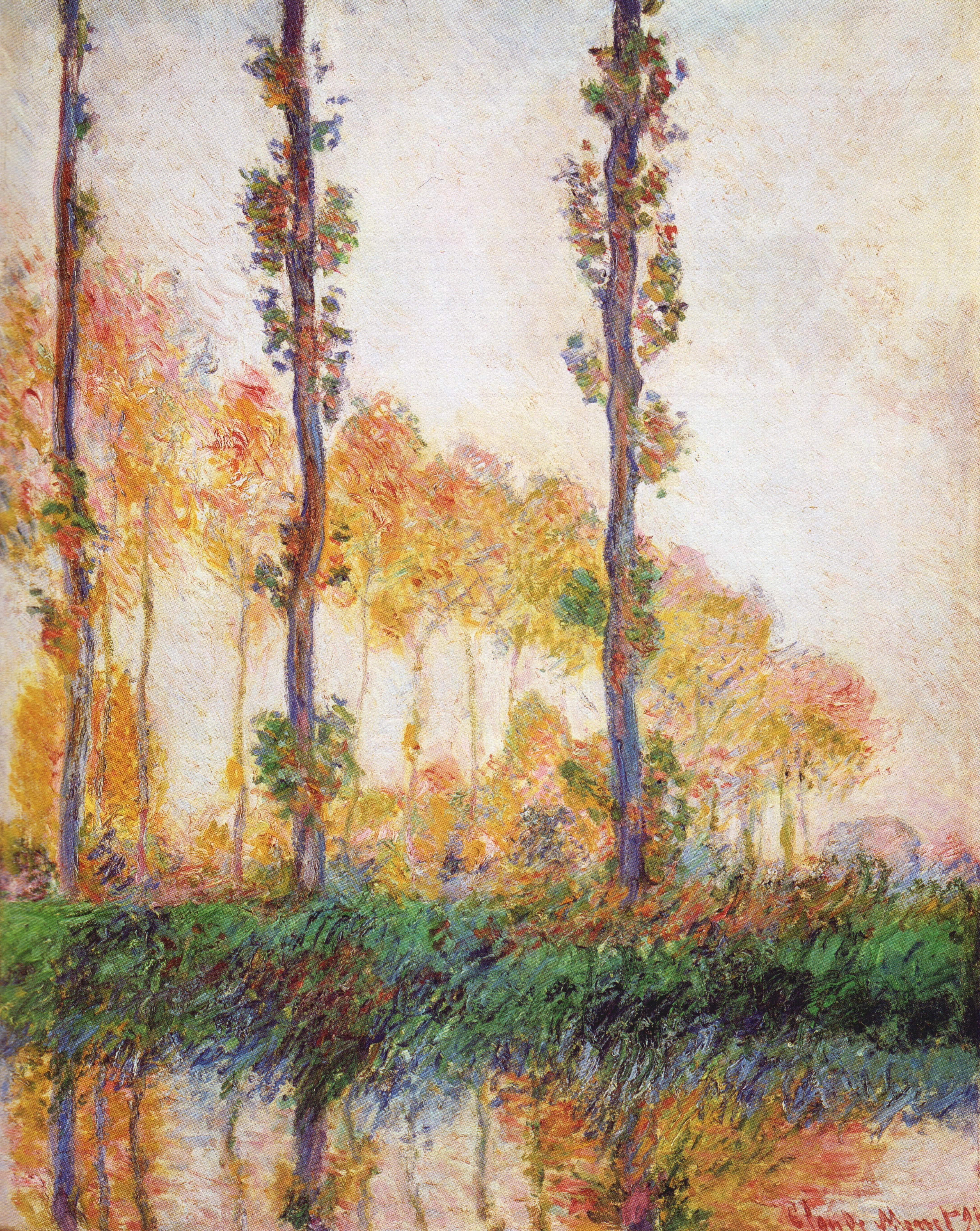 Тополя на берегу Эпт, осень, фр. Peupliers au bord de l’Epte, automne. 100 × 65 см. Справа внизу подпись и дата: Claude Monet 91. Частная коллекция. | Выкуплена у Моне в январе 1892 года Полем Дюран-Рюэлем и впервые показана публике 29 февраля — 10 марта 1892 года на выставке в его галерее, затем продана Генри Сейлсу из Бостона, США. 14—15 января 1920 года была выставлена на распродаже собрания Сейлса в отеле «Плаза», Нью-Йорк, где вновь была выкуплена Полем Дюран-Рюэлем. В том же году выставлялась в галерее «Недлер». 30—31 марта 1949 года проходила на торгах аукционного дома «Парк-Бернет», где была приобретена Куртом Ф. Пантцером из Нью-Йорка. 19 мая 1982 года была выставлена на торги в аукционном доме «Кристис» и продана в неназванную частную коллекцию[22]. |