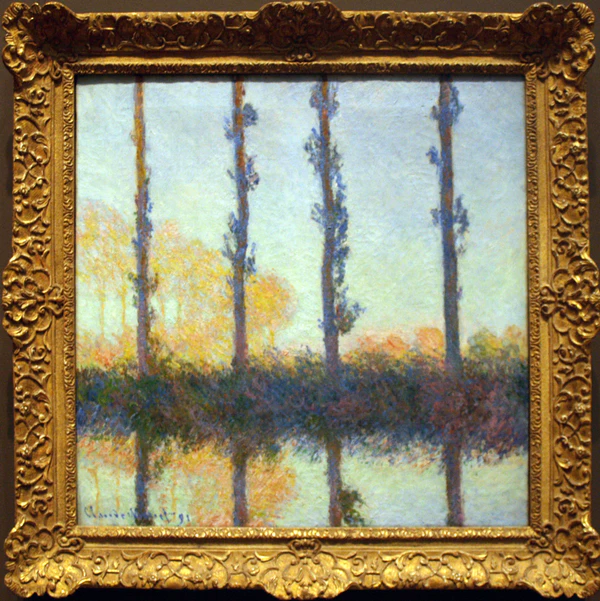 Четыре дерева, фр. Les Quatre arbres. 82 × 81.5 см. Слева внизу подпись и дата: Claude Monet 91. Метрополитен-музей, Нью-Йорк, США. Инв. № 29.100.110. | Впервые показана публике 29 февраля — 10 марта 1892 года на выставке в галерее Поля Дюран-Рюэля. Выкуплена у Моне в 1892 году парижской галереей «Омман» по поручению своего нью-йоркского контрагента галереи «Недлер». 11—14 апреля 1893 года выставлена на распродаже в Чикеринг-холле в Нью-Йорке, где её выкупил Поль Дюран-Рюэль. В 1895 году картину приобрёл Генри Осборн Хэвемайер. По его завещанию картина в 1929 году поступила в состав собраний Метрополитен-музея[38]. |