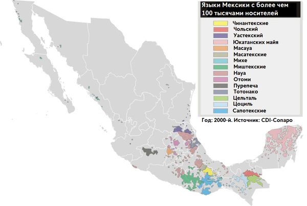 Доля говорящих на аборигенных языках в Мексике сравнительно мала по сравнению с другими странами Латинской Америки, при этом аборигенная топонимия Мексики сохранилась достаточно хорошо[5]. Данные по численности и языковому составу аборигенного населения значительно разнятся. Так, по данным комиссии по развитию коренных народов (CDI) и Национального Института Языков Народов (INALI), около 6 % населения Мексики говорят на языках коренных народов, в то время как идентифицирует себя индейцами 10-14 % населения. По оценке И. П. Литвина, в начале 1960-х годов на территории Мексики сохранялось 125 индейских языков и диалектов[6], а в настоящее время правительство Мексики признаёт 68 отдельных коренных языков (из семи различных семей и четыре других языка-изолята), из которых наиболее изучены языки группы науа, где главной этнической подгруппой являются ацтеки. Майяские языки изучено значительно хуже[5].