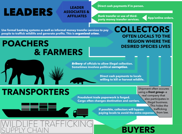 Интерпол оценивает объём незаконной торговли дикой природой в 10-20 млрд долларов США в год. Хотя торговля носит глобальный характер, с маршрутами на все континенты, экологи отмечают, что наиболее острая проблема наблюдается в Юго-Восточной Азии. Здесь торговые связи с ключевыми рынками Китая, США и Европейского союза, слабое правоприменение, недостаточный контроль на границах и восприятие высокой прибыли при низком риске способствуют масштабной коммерческой торговле дикой природой[41]. Сеть по обеспечению соблюдения законодательства о дикой природе АСЕАН (ASEAN-WEN), поддерживаемая Агентством США по международному развитию и внешними донорами, является одним из ответов на региональные сети незаконной торговли дикой природой. Нет чёткой связи между легальностью торговли дикой природой и её устойчивостью; вид может быть легально истреблён торговлей, но также возможно, что незаконная торговля может быть устойчивой[42].