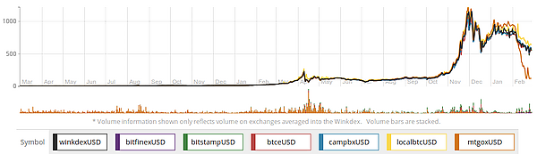 Mt.Gox — первая из крупных площадок купли-продажи криптовалют, располагалась в Японии. В конце февраля 2014 года торги были остановлены[18] в связи с кражей у Mt.Gox крупной суммы биткойнов[19]. Стало известно, что в программном обеспечении Mt.Gox, написанном владельцами для внутренних нужд, была уязвимость, которая позволила злоумышленникам незаметно украсть около 650 тыс. биткойнов[20]. 15 апреля 2014 года компания подала в суд Токио заявление о собственной ликвидации[21].