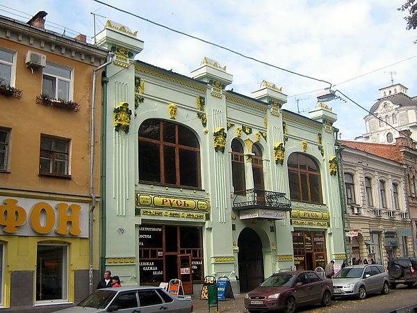 У здания небольшой по длине уличный фасад, выполненный в стиле «эклектика с элементами модерна»[5]. Отсутствует одна из главных примет модерна — асимметричность, однако есть многие другие его черты: огромные окна-витрины, пропорции и очертания которых заимствованы из модерна, крупные маскароны в виде женских голов, в волосы которых вплетены цветы кувшинок и раковины, а также ажурное ограждение балкона[4].