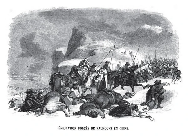 5 января 1771 году нойоны во главе с молодым наместником Калмыцкого ханства Убаши[8] подняли улусы, кочевавшие по левобережью Волги, и начали свой переход на свою историческую родину — в Джунгарию. Их длинный и долгий путь проходил через казахские степи. Всего вышло 33 000[3] или по другим данным 30 909[2], 30 000[9] кибиток или около 140 000—170 000 человек[3][5][10].
