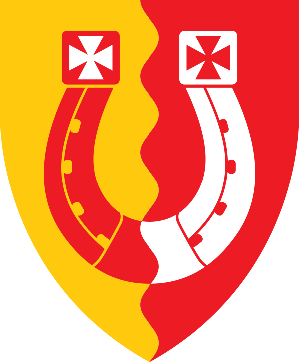 Герб: На золотисто-красном разделённом продольной волнистой линией щите — расположенная пяточной частью вверх красно-серебряная подкова с, соответственно, серебряным и красным лапчатыми крестами на концах.