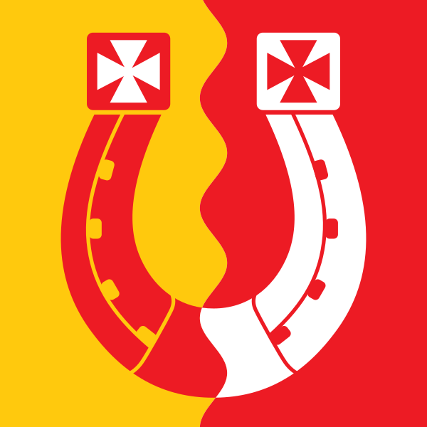 Флаг: геральдический гербовый флаг. Золотой цвет заменён на жёлтый, серебристый — на белый. На жёлто-красном разделённом продольной волнистой линией полотне — расположенная пяточной частью вверх красно-белая подкова соответственно с белым и красным лапчатыми крестами на концах. Соотношение ширины и длины флага 7:8, нормальный размер 105x120 см.