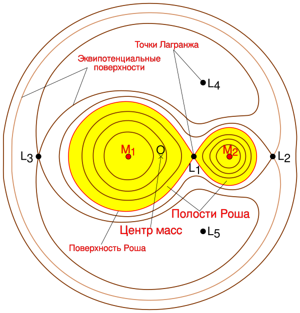 Если M2 много меньше по массе, чем M1, то точки L1 и L2 находятся на примерно одинаковом расстоянии r от тела M2, равном радиусу сферы Хилла: