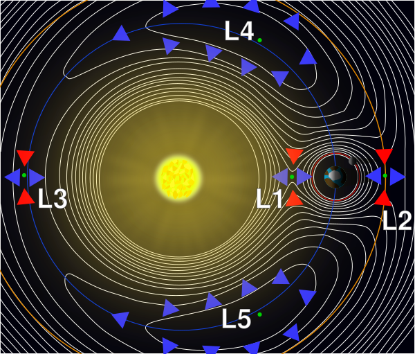 - Пример: у объектов, расположенных за орбитой Земли (от Солнца), орбитальный период почти всегда больше, чем у Земли. Но дополнительное влияние на объект силы тяжести Земли, помимо действия солнечной гравитации, приводит к увеличению скорости вращения и уменьшению времени оборота вокруг Солнца, в результате в точке L2 орбитальный период объекта становится равным орбитальному периоду Земли.