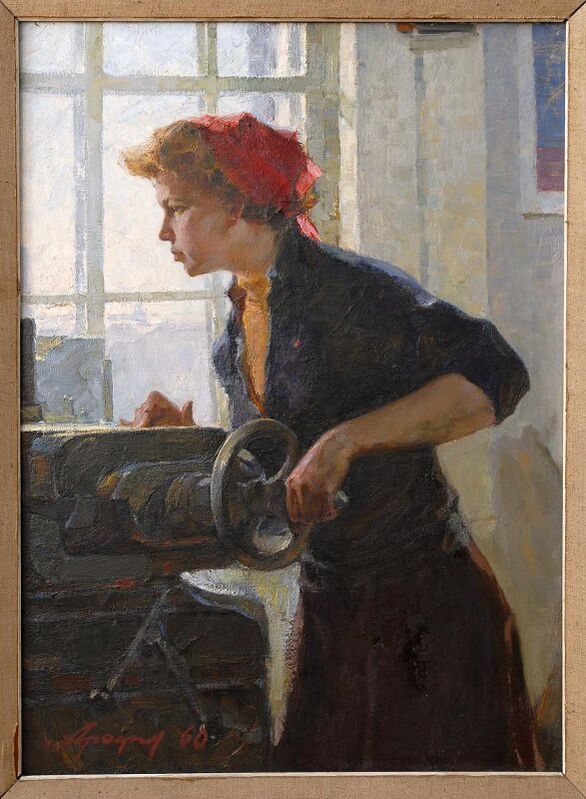 На холсте представлена молодая женщина в профиль, слегка наклонив корпус вперёд. Фигура смещена влево относительно центра композиции, что подчёркивает её связь с окружающей производственной обстановкой.