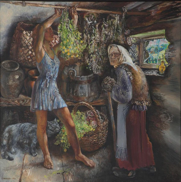 На полотне изображён интерьер деревянной избы. Композиционно в центре картины, в полный рост, помещены фигуры девочки и бабушки. Девочка босая, в голубом сарафане, подвешивает пучки цветущих трав у потолочного перекрытия. Бабушка в белом платочке и очках, обернувшись, смотрит на зрителя через плечо. На деревянной скамье расставлены крынки и корчаги. Справа в стене прорублено небольшое окно. У ног девочки расположен серый кот, нюхающий травы, собранные в корзине.