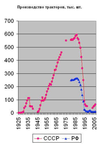 Несмотря на сохранившуюся дореволюционную производственную базу (пять заводов пригодных для изготовления тракторов) и наличие собственных разработок (тракторы «Гном», «Коломенец-1», «Карлик», «Запорожец», «Коммунар»), советская промышленность не смогла дать сельскому хозяйству ни достаточного количества тракторов, ни высокого качества выпускаемой продукции. В 1924-25 годах планировалось выпустить 1 120 тракторов, однако этот план не был выполнен. В 1925—26 годах планировалось выпустить 1 800 тракторов всех типов (с одновременной закупкой за рубежом 14 950 машин); фактически же было произведено менее 900 тракторов, большинство из которых «разваливалось на части после нескольких недель или месяцев работы»[15]. Тем не менее, таким образом были заложены основы отечественного тракторостроения и подготовлены первые кадры тракторостроителей. Дальнейшее развитие страны требовало строительства крупных специализированных тракторных заводов. Используя полученную от продажи зерна, леса, нефти и нефтепродуктов валюту, с помощью американских и европейских инженеров и поставок оборудования нескольких сотен иностранных компаний, были построены: Сталинградский тракторный завод в 1930 г. (выпускал тракторы СТЗ-15/30 (McCormick Deering 15-30 фирмы «International Harvester»)), Харьковский тракторный завод в 1931 г. (выпускал тракторы ХТЗ, подобные тракторам СТЗ), Челябинский тракторный завод в 1933 г., выпускавший гусеничные тракторы С-60 (Caterpillar Sixty). За десять предвоенных лет отечественная промышленность произвела для сельского хозяйства порядка 700 тыс. тракторов. Общий выпуск отечественных тракторов составил 40 % их мирового производства.